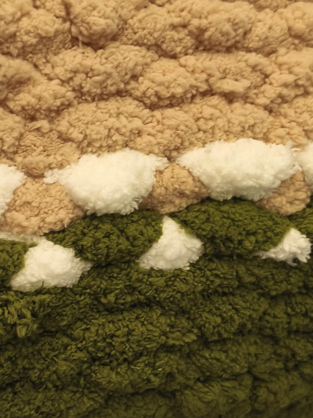 Conçu dans une maille épaisse en fil polyester ultradoux, il séduit par son look moelleux et sa couleur beige et kaki qui ne passe pas inaperçue.