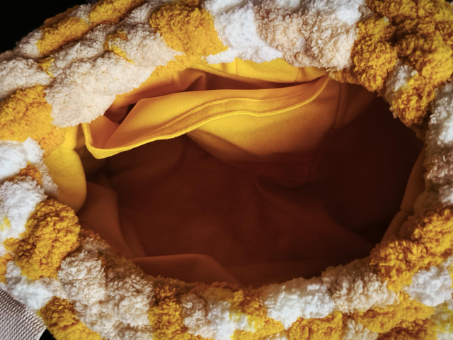 Conçu dans une maille épaisse en fil polyester ultradoux, il séduit par son look moelleux et son dégradé de couleurs mêlant jaune lumineux et tons crèmes raffinés, faisant de lui un accessoire élégant et unique pour illuminer vos tenues.